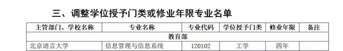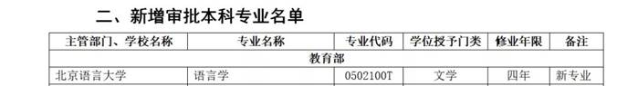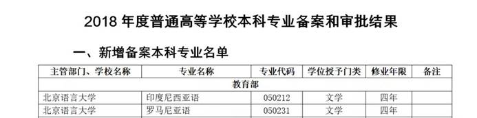 北语“语言学”等三个新本科专业获教育部批准 近日,教育部发布了《教育部关于公布2018年度普通高等学校本科专业备案和审批结果的通知》(教高函〔2019〕7号)。我校申报的罗马尼亚语、印度尼西亚语、语言学三个本科专业成功获批设立新专业,信息管理与信息系统专业的学位授予门类从管理学获批更改为工学学位,其中语言学专业是国家目录外新专业。