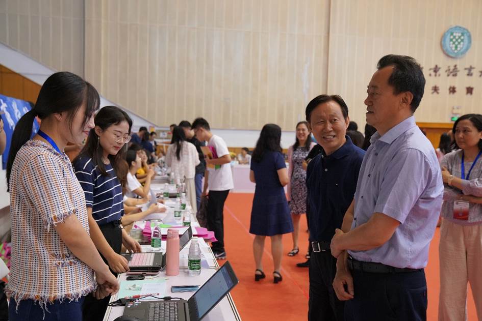 2019年9月8日,北京语言大学语言学系迎来了首批“语言学专业”本科生,研究生同时报到入学。北京语言大学校党委倪海东书记、北京语言大学刘利校长、马贵生副书记、张旺熹副校长、黄益方副校长、学生处黄展处长、招生就业办公室王悦主任等莅临询问工作进展,并慰问新生和志愿者。