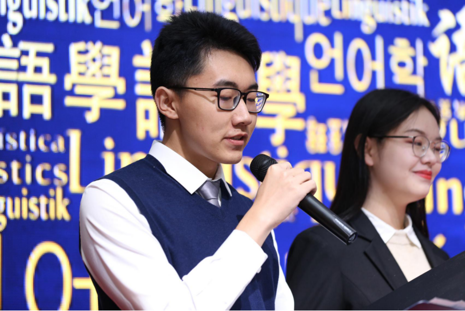2019年10月25日,首届“改写分界线”语言学系建设国际研讨会在北京语言大学逸夫报告厅拉开帷幕。来自欧洲、亚洲和北美洲以及中国大陆和港澳台等14个国家和地区数十位学者,出席了本次大会。会议分为开幕式、主题报告、圆桌会议讨论三个环节。  本科新生代表曹天澄、贾孟溪 本次会议的开幕式由北京语言大学语言学系首批本科新生代表曹天澄、贾孟溪主持。在欣赏了精彩的民乐演奏之后,与会专家及学者通过视频回顾了语言学系的成立历程。 北京语言大学校长刘利教授致欢迎辞