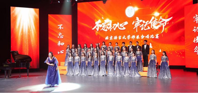 2019年11月23日晚,由共青团北京语言大学委员会、学生处主办的“不忘初心、牢记使命”北京语言大学师生合唱比赛在梧桐会堂隆重举行。校党委书记倪海东,党委副书记、纪委书记马贵生,党委常委、副校长黄益方莅临本次活动。 经过近一个月的精心准备,语言学系合唱队作为第一次参赛的队伍,带来了一场精彩的视听盛宴,最终荣获三等奖和最佳组织奖。 语言学系合唱队由21名研究生和15名本科生组成,几乎倾尽语言学系全部力量。从第一次排练到最后的比赛,合唱队经历了近一个月的刻苦训练,系主任司富珍教授全程进行专业的发声指导。一次次排练只为唱响更昂扬动人的时代之声,一声声鼓励只为以更饱满的精神状态深情告白祖国,华美的服饰和精致的妆容只为绽放更自信明艳的北语学子风貌。 语言学系合唱队作为第10个出场的队伍,带来了《我们都是追梦人》和《明天会更好》两首歌曲。一首欢快热烈,一首悠扬婉转,两首风格迥异的歌曲碰撞出了别样的火花。领唱同学歌唱水平极佳,声动梁尘,其他同学齐声合唱,将满腔热血与报国之心融入嘹亮的歌声中,两相呼应,共同带来了精彩绝伦的表演。 本次合唱比赛中,同学们以歌声献礼祖国,展现了语言学系的青春朝气与昂扬斗志,充分显示了语言学系学子积极进取的精神风貌,希望同学们今后依然“不忘初心、牢记使命”,心系祖国,长歌相伴!  比赛现场