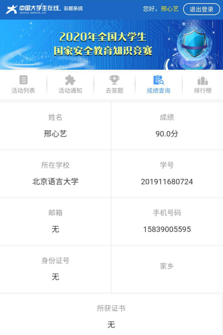 二、“2020全国大学生国家安全教育知识竞赛”活动 以下展示部分同学的成绩单,以及知识竞赛满分同学的奖状。 1. 部分同学的竞赛成绩单