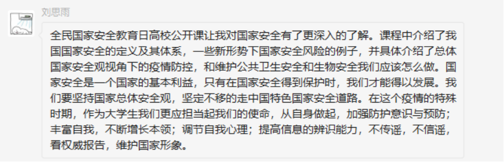 作者:姚晓霞 为提高当代大学生的国家安全意识,语言学系积极开展“4•15全民国家安全教育日”活动。因现下全国范围内仍处于抗“疫”特殊时期,因此,此次活动仍以线上形式为主。活动形式有二,其一,鼓励学生参加“同上一堂国家安全教育课”活动,观看学习“2020年全民国家安全教育日高校公开课”,并在学习后进行线上讨论。其二,鼓励学生参加由 “2020全国大学生国家安全教育知识竞赛”活动,进行线上答题。 本次活动,学生们都积极参与,反馈良好,活动详情如下。 一、“同上一堂国家安全教育课”活动 同学们积极学习公开课内容,并展开讨论,通过反馈,可见同学们都颇有收获。以下展示第一项活动的活动详情。 1. 同学们认真学习的影像