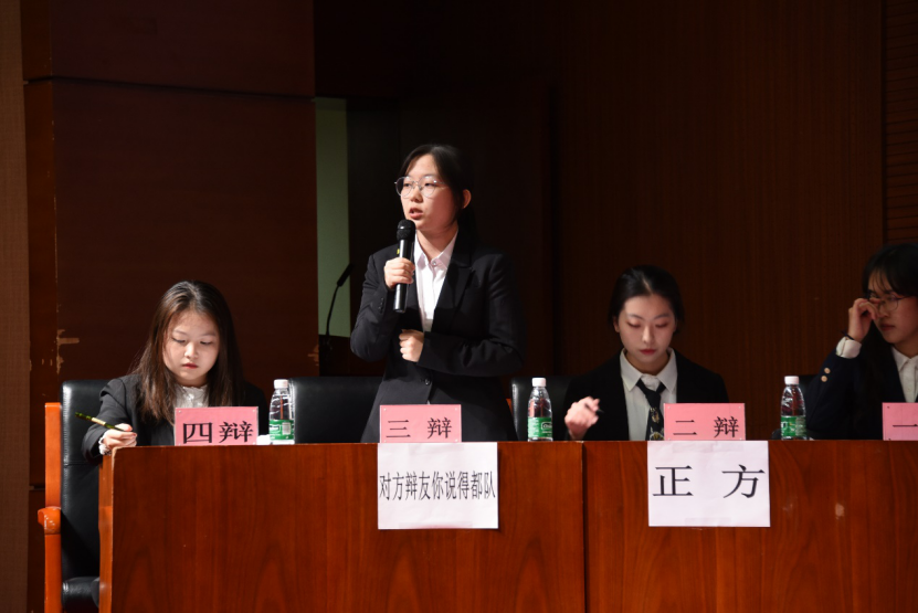 语言学系20级申银珍参加辩论 此次辩论赛辩题为“顺从世界是否会过得更好”。申银珍同学为正方代表队三辩,队伍所持观点是“顺从世界会过得更好”。