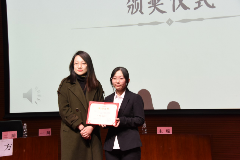 三辩申银珍盘问对方一、二、四辩 辩论赛中,申银珍同学表现相当出色。在三辩盘问环节和盘问总结等环节表现出冷静和稳重,思维的缜密,语言的流畅,所用论据有理有据。 最终,申银珍同学优异的表现令现场观众与评委印象深刻,获得“最佳辩手”的奖项,同时,申银珍所在队伍也成为了本次“清音杯”新生辩论赛的冠军队伍。