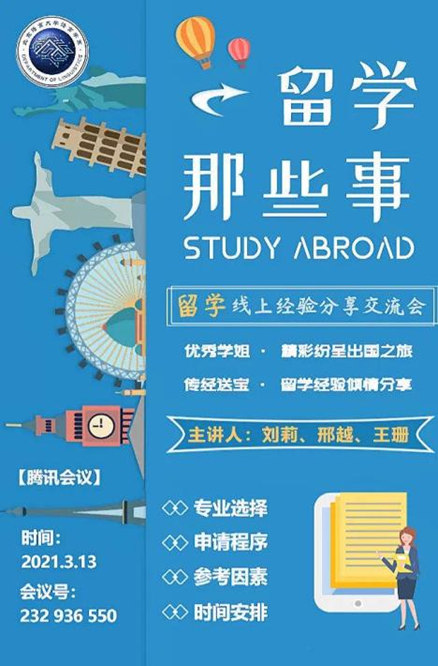 作者:语言学系本科生团支部 为了解答同学们在学习生活中对生涯规划的困惑,引导同学们正确定位个人发展方向,自觉树立正确的成才观和就业择业观,语言学系于新学期组织举办生涯规划系列活动。 3月13日生涯规划系列活动第一场——留学专场通过腾讯会议的方式开展。本场活动邀请到分别来自香港中文大学、匈牙利罗兰大学和英国华威大学的硕士博士学姐,结合自己的亲身经历,为大家解答从准备申请留学到出国深造过程中可能会遇到的各种问题。