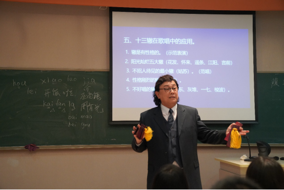 本次讲座题为《以字行腔》讲唱会-论歌唱语言和自然语言,以半演唱会半讲座的形式进行了精彩的演讲。将语言学学术讲座和音乐体验结合,以十三辙十八韵在声乐艺术中的运用为线索,介绍戏曲、曲艺等声乐形式中语言学知识的作用。冯宝宏教授利用歌唱技巧,现场歌唱演示对语言知识进行了讲解,将语言知识诠释的淋漓尽致。讲座过程中,冯宝宏教授进行了一段生动有趣的快板表演,现场师生无不沉浸在教授的精彩演讲中。