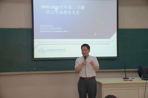 作者:曾治璇 2021年7月9日星期五, 2020-2021学年第二学期语言学系期末大会在主楼南201教室顺利举行。语言学系全体师生齐聚一堂,以饱满的热情参与此次总结大会。语言学系主任司富珍教授、副主任熊仲儒教授,教师代表卢德平教授、孙晓晨博士、王文颖博士、学生工作办公室孟雪老师参加了本次大会。 下午三点十五,期末大会正式开始,本次大会以优秀学生代表们讲述科研经历和参与重大活动的感受作为主线,总结语言学系2020-2021学年第二学期的主要工作。大会以辅导员孟雪老师向全系同学提醒暑期注意事项开始,希望同学们始终将各类安全事项谨记心间。