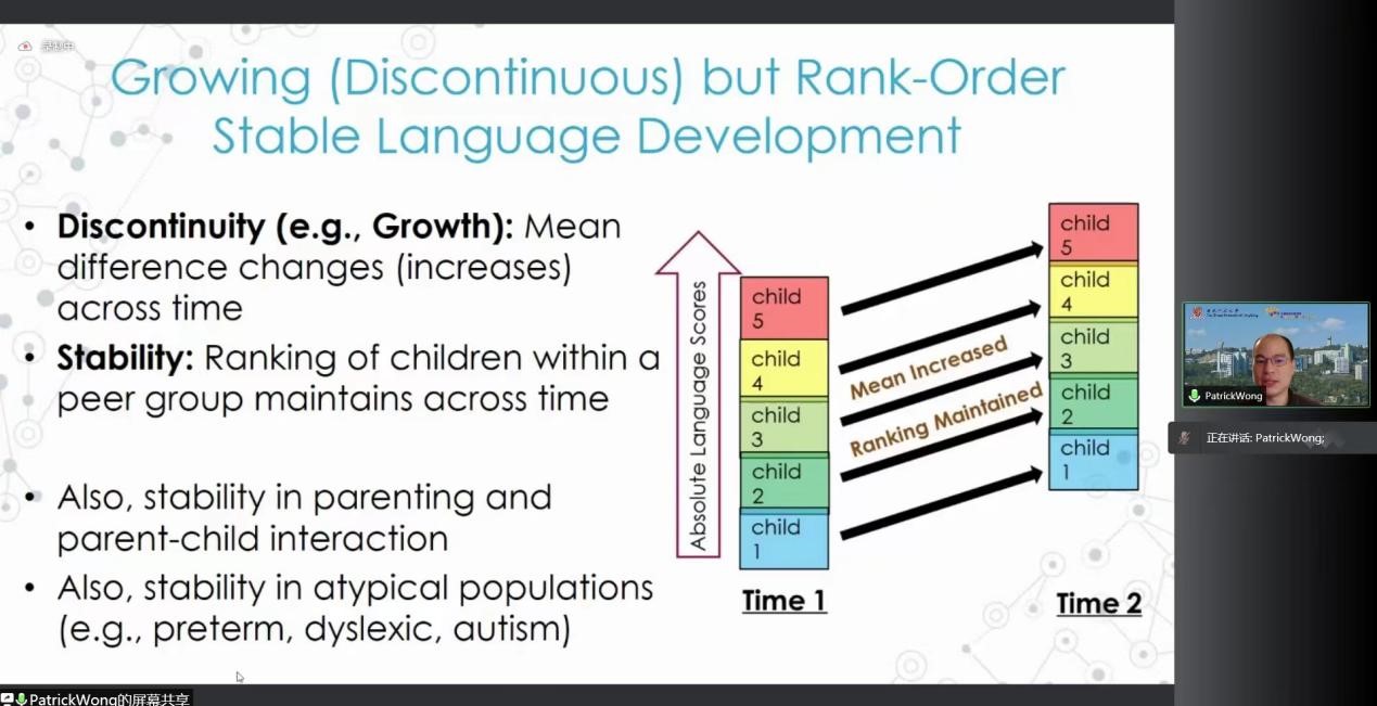 本次讲座题为“不同人群语言学习的个体差异预测”,儿童语言发展的等级顺序稳定性为利用早年收集的数据来预测未来语言发展提供了机会。黄教授利用这个机会来评估有关典型和非典型人群语言发展的不同假设,用来自幼儿的直接生物学测量以及他们的健康和家庭信息构建针对不同个体的预测模型。这些模型为解决有关神经处理和语言的不同问题提供了基础。