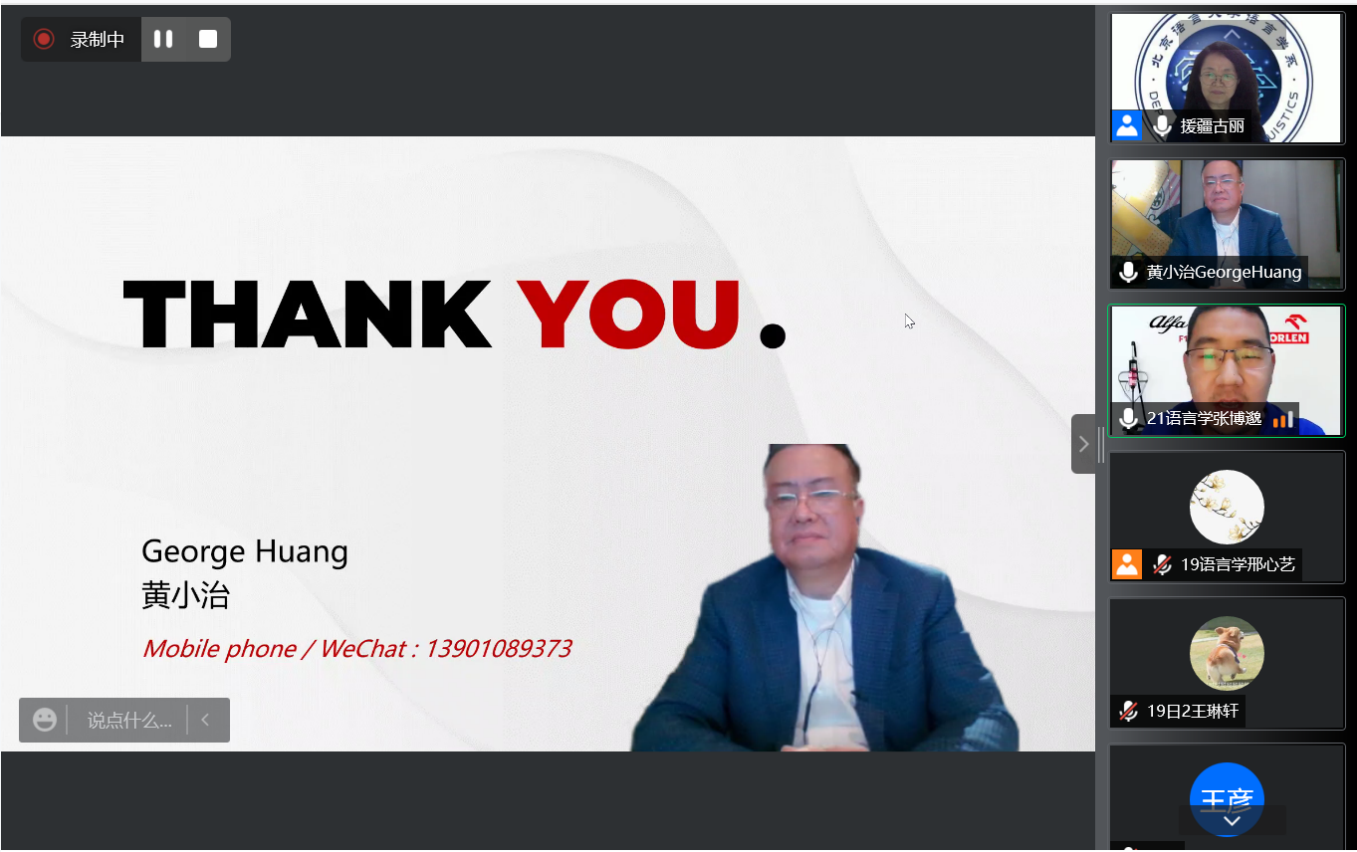 为了迎接北语60年校庆,应北京语言大学语言学系邀请,北京语言大学1978级英语专业校友、中国商业联合会奢侈品专业委员会主任,北京语言大学企业家校友会会长、客座教授黄小治研究员为同学们带来了题为“Speak with Power and Confidence高效演讲”的讲座。本次讲座由北京语言大学语言学系系主任司富珍老师主持,吸引了校内外众多师生的关注和参与。