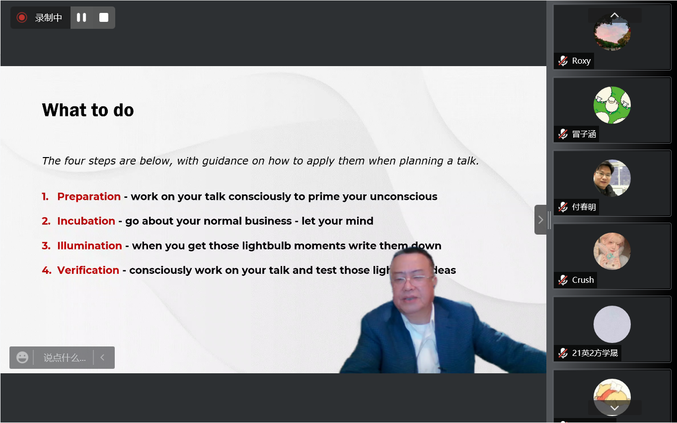 讲座伊始,黄小治老师以克林顿总统、奥运冠军谷爱凌等人的例子论证高效演讲的重要性。首先,黄老师说到,演讲最重要的内容就是克服害怕的心理,即“How to make your point and have it stick”,并且给出了诸如“rehearse”等实用的具体方法。其次,黄老师从“Prepare”“Incubation”“Illumination”“Verification”等角度为大家详细分析了演讲中的技巧及需注意的要点。期间,黄老师为大家播放了美国总统克林顿在北京大学百年校庆时的演讲、美国总统奥巴马在上海的演讲、影视剧《跨过鸭绿江》片段等视频资料,并且引出了幽默、听众角度、互动等因素对于演讲的重要性。下一部分,黄老师从声音、站姿、眼神交流等角度为大家揭示了演讲中应该注意的细节性问题。最后,黄老师引用George Elliot的名言“It never will rain roses. When we want to have more roses we must plant trees. ”来勉励大家勤于练习,不断进步。