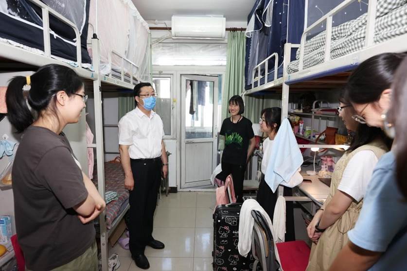 9月6日中午,刘利校长在学生处武玉洲副处长、语言学系赵璞副书记的陪同下,来到部分语言学系新生宿舍,看望同学们。刘校长与新生亲切交流,询问他们来自哪里,生活是否习惯,并嘱咐大家,一定要认真学习,利用大学时光努力成长成才。