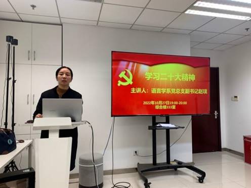 2022年10月27日晚,语言学系党总支副书记赵璞同志带领语言学系学生支部全体党员共同学习党的二十大精神。