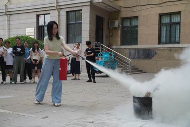 讲座结束后,孙健老师带领大家前往教一楼北侧,在保卫处多名工作人员的协助下,开展了灭火器和消防栓的使用讲解和实操训练。语言学系多名老师和同学们积极参与互动,亲身尝试使用了灭火器和消防栓,对消防工具的正确使用有了更具象的了解和体会。