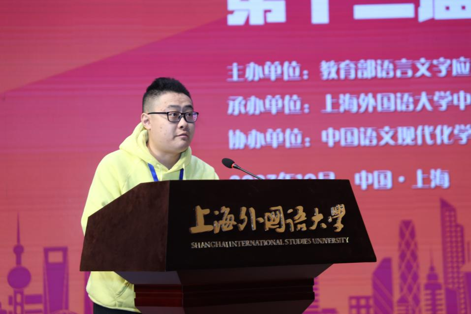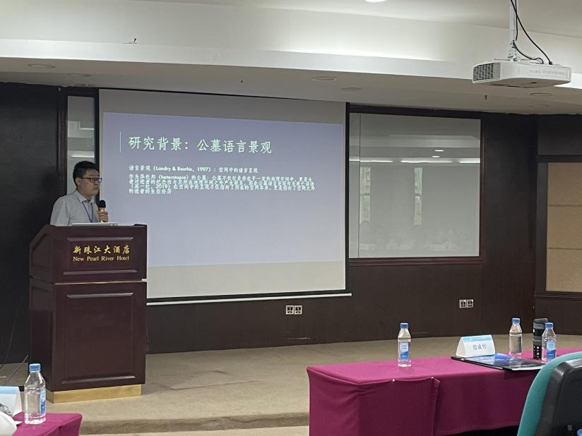 殷成竹博士后做主旨发言 10月27日,殷成竹博士后受邀参加第十二届全国社会语言学学术研讨会并在“语言景观与语言调查”分论坛做学术报告,报告题目为“外语”在教育场域空间中的建构:对高校外语院系楼宇语言景观的考察。该研究选取北京某高校外国语学院楼宇作为了研究对象,基于语言景观话语框架理论(Coupland & Garrett,2010)对其语言景观进行分析,以探讨“外语”如何通过教育场域空间的语言景观进行意义建构的。研究发现,该校外语院系楼宇语言景观包含了四类主要的话语框架:“通用语框架”、“区域国别框架”和“本族语(者)框架”与“文化对话框架”,对这些话语框架的分析也揭示了外语教育场域空间语言景观所构成的话语是一种隐性语言教育政策的。基于此,该研究揭示了校园语言景观建设对于外语教育政策与规划的重要作用。 最后,殷成竹博士后代表第二组分论坛全体发言人做总结汇报。他将本组发言人的研究特点归纳为两个“多样”,其一是研究领域多样,其二是使用理论多样。首先,所谓“研究领域多样”指的是发言专家的研究涉及到了不同类型的场所或空间的语言景观研究。第二个“多样”,便是使用理论多样,像超语实践、时空体、地理符号学、多模态话语分析等语言学与符号学理论,乃至一些社会学、人类学理论在本组的研究中都得到了应用,充分体现了语言景观研究的灵活性。殷成竹博士后认为语言景观与其说是社会语言学的一个分支学科,不如将其看作是社会语言学的一个研究对象,即空间中语言符号的呈现,它天然地可以与社会语言学的各个分支(如语言变异、言语交际、多语现象、语言政策等)相结合,甚至可以进行跨学科研究,是社会语言学研究中的一个“富矿”,他希望能够有更多同仁能够加入语言景观研究的队伍中。