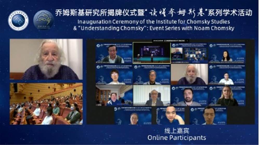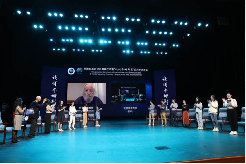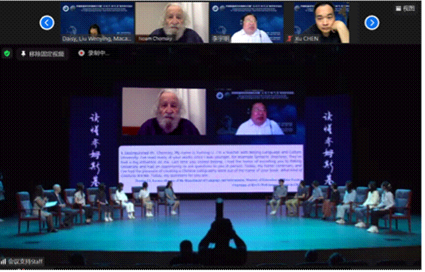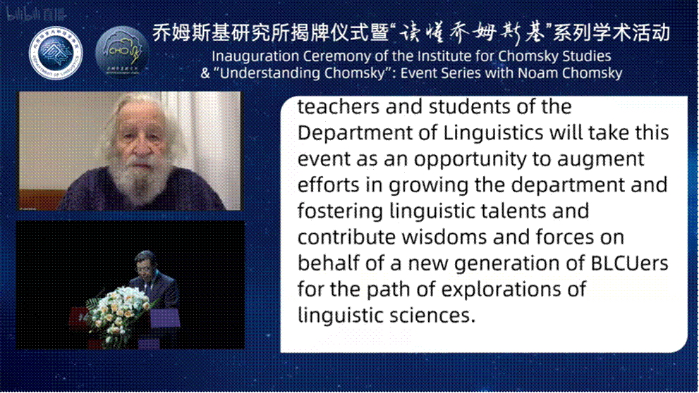 Author: Wenying Wang Professor Noam Chomsky, a cognitive scientist, a linguist, and a philosopher, enjoying a high prestige in the world, visited the Department of Linguistics from BLCU online. He participated in the Inauguration Ceremony of the Institute for Chomsky Studies & “Understanding Chomsky”: Event Series with Noam Chomsky and received the honorary title of“Leading Scientist in Biolinguistics and Human Brain Sciences”. No.1 Inauguration Ceremony of the Institute for Chomsky Studies & Ceremony toAward Prof. Chomsky the Honorary Title of “Leading Scientist in Biolinguistics and Human Brain Sciences” Ceremony to Award Prof. Chomsky the Honorary Title of “Leading Scientist in Biolinguistics and Human Brain Sciences” was held as the prelude of “Understanding Chomsky”: Event Series with Noam Chomsky in the WuTong Hall. In order to express our salute to Professor Chomsky’s contributions to exploring the universe of human language and cognition, Principal LiLiu delivered a welcome speech and awarded the honorary title to him. Principal LiLiu also highly praised his great devotion to interdisciplinary linguistics, especially in branch disciplines related to brain science and life science, such as biolinguistics, psycholinguistics, and neurolinguistics. Principal Liu reviewed the dedication to introducing and spreading the theories of generative grammar made by older linguists such as Professor Lifang. Meanwhile, he deeply believed that the success passed down from generation to generation had established the station of BLCU as one of the centers in China’s generative grammar research. Based on the long-term academic groundwork and sufficient talented people, the Department of Linguistics is boosting by virtue of their joint efforts. Entering BLCU in 2019, the undergraduates will finish their 4-year university time next year as the first undergraduates from the linguistic major both in BLCU and in China. Besides, the first master’s students and Ph.D. students from the Language & Human brain science major have stepped into BLCU for two years. Time has witnessed the preponderance of the Department of Linguistics. Learning the elements of the “Chomsky Revolution” and cultivating skilled people for Chinese linguistics will be the first priority of the Institute for Chomsky Studies.